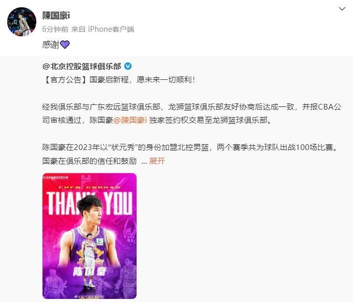 陈国豪本人也在社媒回复了两家俱乐部。对于老东家北控,陈国豪写道:“感谢”