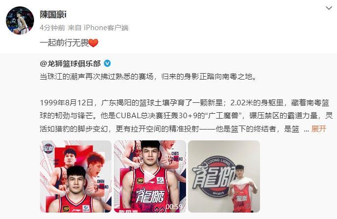 对于新东家广州男篮,陈国豪则写道:“一起前行无畏❤️”